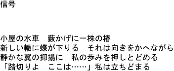 A water wheel by the mill. A lone camellia tree in the shade of a thicket.A butterfly flutters down to a newly made rut, moving in different directions,