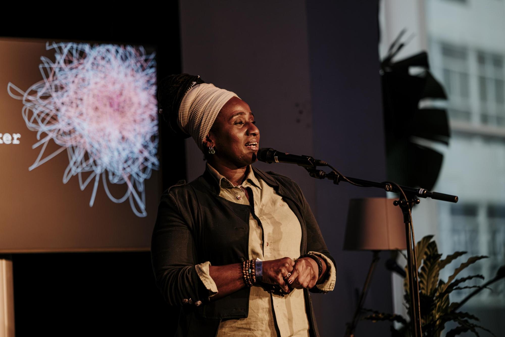 Each month, she collaborates with local poets to inspire and engage through poetic activities like pop-up performances, workshops, street writing, and declamations in vibrant and unexpected places—from markets and community centres to prisons and thrift shops.