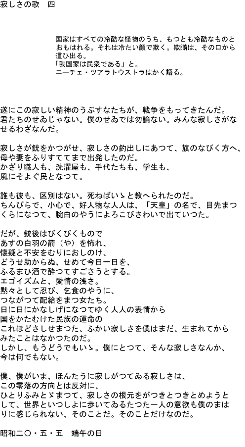 遂にこの寂しい精神のうぶすなたちが、戦争をもってきたんだ。君たちのせゐじゃない。僕のせゐでは勿論ない。みんな寂しさがなせるわざなんだ。