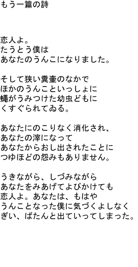 This poem is included in Human Tragedy, a lengthy autobiographical account with poems and prose that, according to Kaneko, draws together pieces he wrote in the three years following Japan’s defeat, although they are not necessarily arranged chronologically. The dedication of the book is “Vanitas vanitatum, et omnia vanitas”, from “Evangeline”. Was Kaneko referring to the narrative poem by Henry Wadsworth Longfellow?