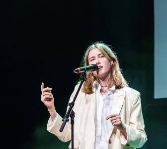 Mirte Bautmans tends to arrive late rather than never, fell in love with water first, and her favorite word is cacophony. She finds inspiration in everyday conversations, turning scattered words into sentences, odes to the people and places that shape her world. Now, in search of a rush of adrenaline, she’s stepping on stage for the first time. Enthusiastic, curious, and unapologetically herself. Trigger warning: she speaks Flemish.