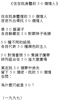 the 50 lovers that live inside my bodygo out nightly in search of another 50 lovers