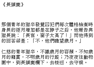 Toen de jonge cipier merkte dat de maandelijkse toename van de lichaamslengte van de gevangenen bij elke lichamelijke inspectie in de nek zat, rapporteerde hij aan de directeur: ‘Meneer, de ramen zitten te hoog!’ Maar het antwoord dat hij kreeg was: ‘Nee, ze zien op naar de tijd.’De goedhartige jonge cipier kende het gezicht van de tijd niet, wist zijn geboorteplaats niet en was niet op de hoogte van zijn verblijfplaats; dus vatte hij elke nacht post in de dierentuin, voor het hek van de giraffen, en wachtte.