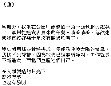 Zondag, ik zit op een ijzeren bank die een poot mist in een afgelegen hoekje van een park te genieten van de lunch die ik in een fastfood-restaurant heb gekocht. Al kauwend bedenk ik ineens dat ik al tientallen jaren geen haan heb gehoord.Met de botten probeer ik een vogel samen te stellen die in staat is de zon te roepen. Ik kan de stembanden niet vinden. Want zij hoeven niet meer te kraaien. Het is hun werk om onophoudelijk te eten, en zij produceren zichzelf.