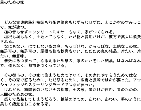 A bare, boundless night garden. A tiny, empty, landless house. Nothing but the crystallized fruit of sighs, unapproved, without a roof, without pillars, without a steel frame. Cold, cold meaninglessness.