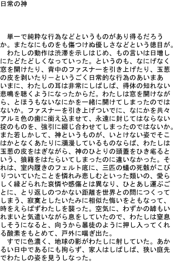Can there be anything like a simple, pure act? A virtue like gentleness that doesn’t hurt anything?My movements began to show stagnation and my speech to lisp as days passed. This was because opening the window unthinkingly, pulling up the zipper on my back, or peeling an onion — between such extremely everyday acts — I began to hear often unidentifiable screams. Was it that in opening the window, I’d also opened something stupendous? Was it that by pulling up the zipper, I’d also forcibly meshed together something — about which there was an eternal injunction against sealing — by making the aluminum teeth hold it fast? Or else, if gods are things that amorphously permeate our surroundings in innocuous form, by taking the skin off an onion, I must have committed the rude act of plucking the skull off one of them. Unlike a cutely hemstitched pity or sentimentality, of the sort of compassion and sorrow you might feel when you find the corpses of three ants stuck to the felt sole of your slipper, these screams assaulted me at any time, accompanied by a regret resembling a harrowing pain which, each time I took a step, created an irrecoverable distance between me and the world. Because I was breathing, careful not to make the slightest crack in the air, when I felt suffocated, I staggered out, panting, for oxygen which would kindly push into me like a violent man.