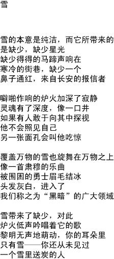 The basic meaning of snow is purity, but what it bringsIs absence: absence of starlight