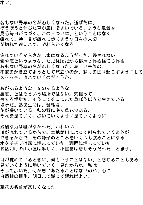 I’ve started to miss the name of those nameless plants. Off to the side of the path,Long, overgrown grass fluttering in waves with the wind, that sort of landscape