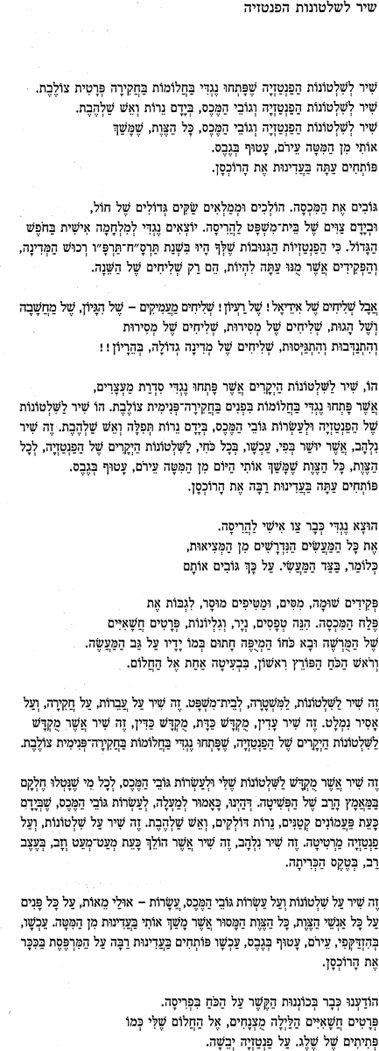 This is an ode to the fantasy authorities who have begun to cross-examine me personally in my dreams. An ode to the fantasy authorities and tax collectors carrying candles and blazing fire in their hands. An ode to the fantasy authorities and tax collectors, the entire crew that pulled me naked out of bed, wrapped in a plaster cast, and who are gently opening a zipper now. They collect taxes. Fill large sacks with sand, with court orders for demolition in their hands. Wage a private war against me during summer vacation. Because your stolen fantasies were government property a long, long time ago, and the newly appointed clerks are just this year’s emissaries. But also emissaries of an ideal! Of a concept! Of logic, of thought – who delve deep – emissaries of philosophy and devotion, of volunteerism and enlistment, emissaries of a great, pregnant nation!! Oh, this is an ode to the dear authorities who have begun a series of arrests against me, who have begun to cross-examine me in my dreams. Oh, an ode to the fantasy authorities and the dozens of tax collectors with votive candles and blazing fire in their hands. It is an inflamed ode, sung by me now with all my might, to the dear authorities of fantasy, the entire crew that pulled me out of bed naked, wrapped in a plaster cast. Now they are gently opening a zipper. They’ve issued a private demolition order against me in particular. Taken all the necessary steps in reality, that is to say, on the practical side of things. For this they charge, these tax assessors, collectors and preachers, take a piece of the pie. Here are forms, sheets of paper, confidential information about the authorized signer and his duly empowered attorney who signed the back of the deed in his own hand. And the leader of the first invading force, one kick into the dream. Oh, this is an ode to the authorities, the police and the court. It is an ode about transgression, investigation and an escaped prisoner. It is a tender ode, properly consecrated, according to the law, an ode dedicated to the dear authorities of fantasy, who have begun to cross-examine me personally in my dreams. This is an ode dedicated to my authorities and to dozens of tax collectors, to everyone who took part in the great effort of the raid. That is, as aforementioned, to the dozens of tax collectors, who hold little bells in their hands now, lighted candles and blazing fire. This is an ode about authorities, about trembling fantasy. It is an inflamed ode, secreting slowly now, very sadly, at the amputation ceremony. This is an ode about authorities and dozens of tax assessors, dozens, perhaps hundreds, in any case the entire crew, the dedicated staff which gently pulled me out of bed. Now that I’m erect, naked, wrapped in a plaster cast, now they are opening a zipper on the terrace in the public square. We’ve let them know we’re on call for the deployed troops. Secrets are parachuted down tonight toward my dream like snowflakes. Upon a dry fantasy.