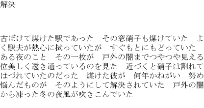 The station was old and covered with soot. Its window panes were also sooty. A station worker would clean them up carefully, but they would soon be as sooty as before. One night I saw one pane beautifully clear, gleamingly showing even the darkness outside. As I came closer, I realized the glass had been broken and removed, which attained what the sooty pane had long wished for, strived for, and moaned over. A freezing wintry wind was blowing in from the darkness outside.