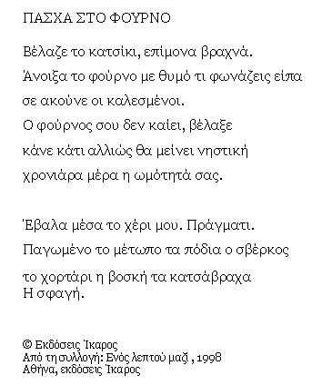 Publisher: Poetry Greece 2 p. 20-23, Corfu, 2000