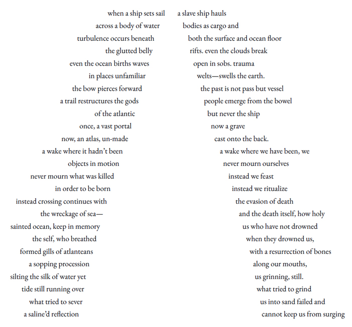 vervoert een slavenschip lichamen als vracht en zowel het oppervlak als de oceaanbodem scheurt. zelfs de wolken breken open in snikken. trauma slaat toe – laat de aarde zwellen. het verleden is geen pas maar vat mensen duiken op uit de darm maar nooit het schip nu een graf gegraveerd op de rug. een wake waar wij zijn geweest, wij rouwen nooit om onszelf in plaats daarvan smullen we in plaats daarvan ritualiseren we de ontsnapping aan de dood en de dood zelf, zo heilig wij die niet zijn verdronken toen ze ons verdronken, met een wederopstanding van botten langs onze monden, wij, grijnzend, nog steeds. wat ons probeerde te malen tot zand faalde en kan onze opstand niet stoppen |