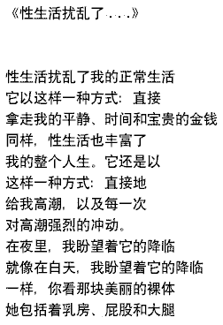 my sex life is wreaking havoc with my everyday life it does so in the following manner: it directly robs me of my peace of mind, time and my valuable cash by the same token, my sex-life enriches my life as a whole. this it does in the following manner: by directly giving me orgasms, as well as that powerful excitation that comes with every orgasm. in the evenings, I start to look forward to its arrival just as in the daytime, I look forward to its approach: see that slab of beautiful naked body, she includes breasts, buttocks and thighs