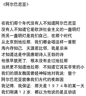back in those days all of us knew about Albania there was no one who didn’t know it was a bright light of European socialism the other bright light was ourselves. back in those days from Beijing to Tirana, we all knew the song with a friend who knows your heart, distance won’t keep you apart. it was only later I realized that these were lines by the Tang-dynasty poet Wang Bo he died long ago, and never went to Tirana of course, we knew nothing about the place: that it was actually extremely small a friend of our, Wei Guo, once said to us mysteriously: the whole of Albania is like the ancient Chinese kingdom of Yelang. I remember this, and I guarantee: it was in 1974 and we had all just turned 12. we thought what he said was reactionary