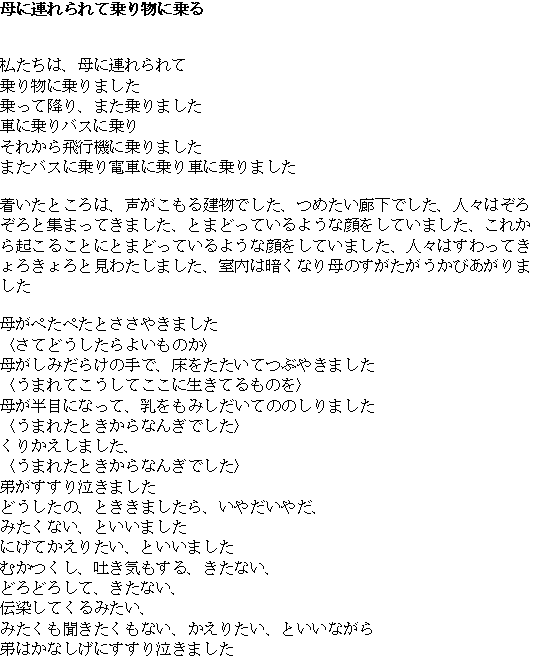 We sleep here and there in the airports, we play here and there in the airports, we tumble over and bump into things here and there in the airports, I get scolded, my little brother cries, food is bought, we don’t eat it all and throw it away, we coax mother for things, we get scolded, there are lots of families like us, parents let their children eat, parents scold their children, some of the families traveling from airport to airport have their hair cut, some have it braided, some have it tied up, some have it shaved right off, but everyone is wearing clothes of different colors, everyone is waiting, everyone is spread out all over the airport waiting all over the place, every last one of them is waiting except for the children who are not eating or sleeping or waiting but tumbling over, bumping into things, and playing just like us