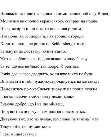To remain at the Dominican school near Vienna forever,To pray just in Ukrainian to the surprise of the nuns.