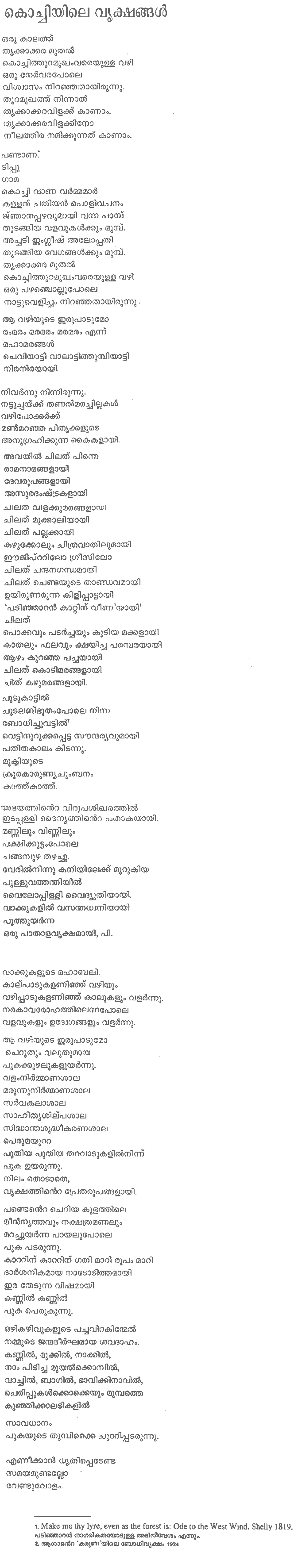 Changampuzha: Changampuzha Krishna Pillai was a close friend of Edappally Raghavan Pillai and one of the most popular Malyalam poets of the twentieth century, whose Ramanan, a pastoral love poem, has sold over a lakh (100,000) copies. He is noted for his sensuous, mellifluous diction. He died young at the peak of his fame.