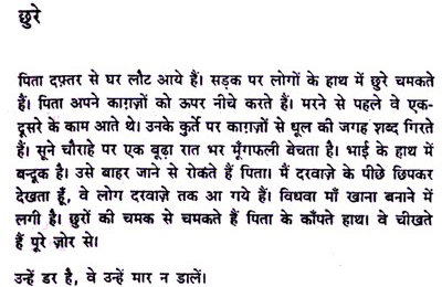 Father has returned from his office. Knives glitter in the hands of people in the street.Father shuffles his papers. Before his death, they were of some use to each other.