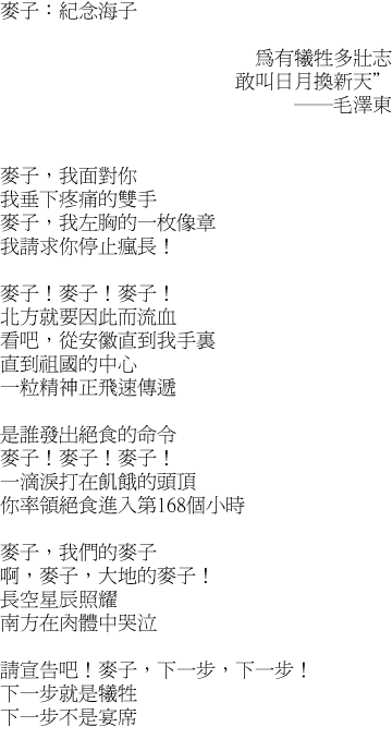 Haizi was the pen-name of Cha Haisheng, a contemporary poet. He was born in Anhui in 1964 and, after a brief but prolific literary career, committed suicide in March 1989. The epigram is from Mao Zedong\'s poem \'Shaoshan Revisted\' [Dao Shaoshan] which was written in 1959.