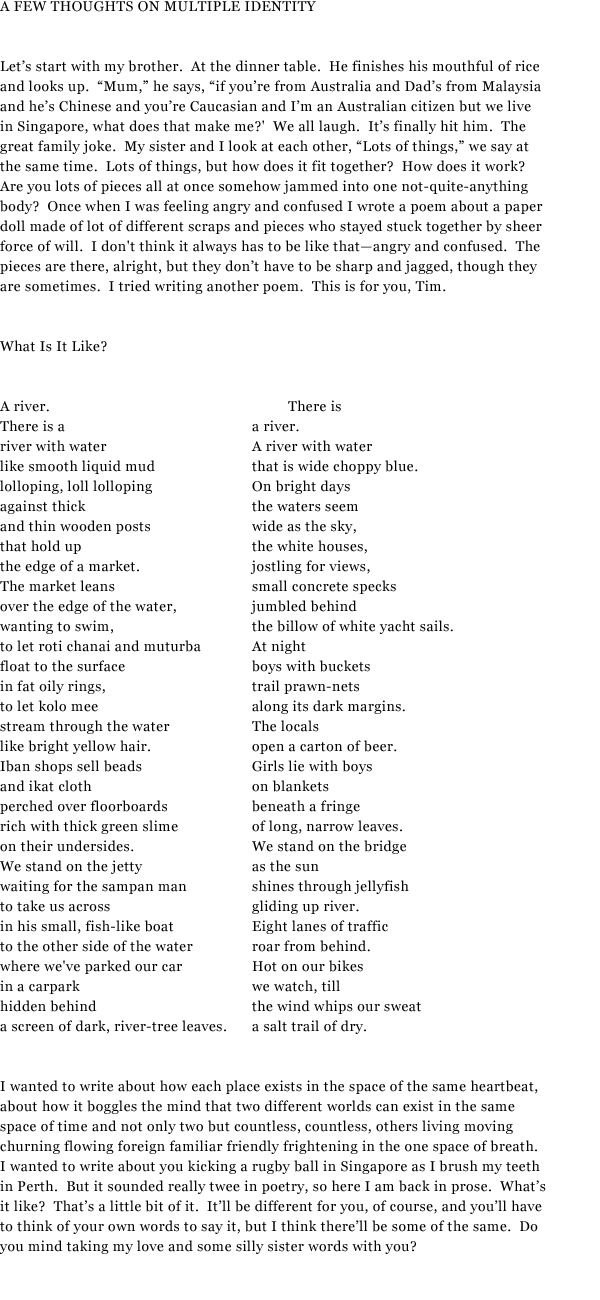 Let’s start with my brother. At the dinner table. He finishes his mouthful of rice and looks up. “Mum,” he says, “if you’re from Australia and Dad’s from Malaysia and he’s Chinese and you’re Caucasian and I’m an Australian citizen but we live in Singapore, what does that make me?’ We all laugh. It’s finally hit him. The great family joke. My sister and I look at each other, “Lots of things,” we say at the same time. Lots of things, but how does it fit together? How does it work? Are you lots of pieces all at once somehow jammed into one not-quite-anything body? Once when I was feeling angry and confused I wrote a poem about a paper doll made of lot of different scraps and pieces who stayed stuck together by sheer force of will. I don\'t think it always has to be like that—angry and confused. The pieces are there, alright, but they don’t have to be sharp and jagged, though they are sometimes. I tried writing another poem. This is for you, Tim.What Is It Like?