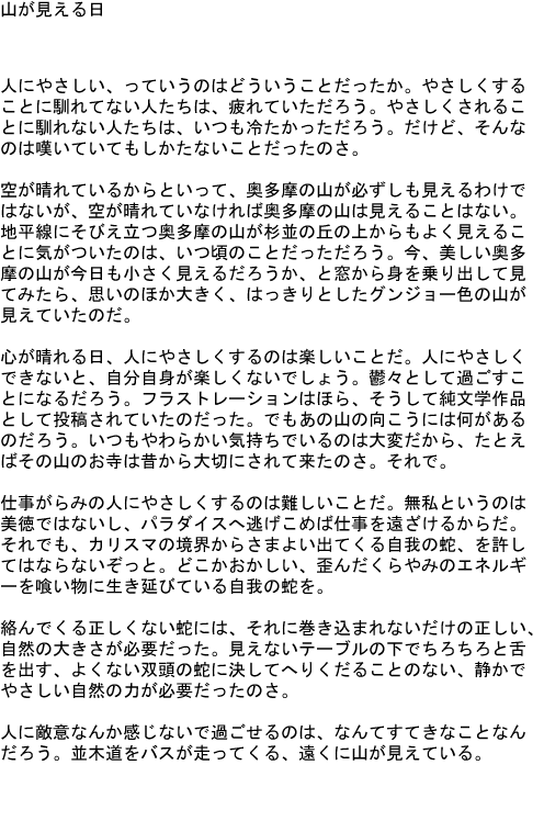 Being nice to people—what was that again? People who aren’t used to being nice just act worn out. People who aren’t used to being treated kindly just keep on living their cold lives. In any case, it doesn’t do any good to complain about that.The fact that the sky is clear doesn’t necessarily mean you’ll be able to see the mountains out there in Okutama, but it’s impossible to see them if it isn’t. When was it I realized you can see the Okutama Mountains on the horizon from the hills of Suginami? Thinking the small outlines of those lovely mountains are probably visible right now, I lean out the window and find I can see the khaki-colored mountains clearly. They’re even bigger than I had remembered.