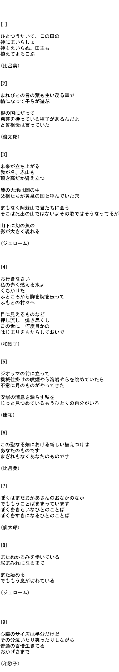 This section is quoted from a song handed down from generation to generation at Aso Shrine, near Kumamoto. The song is chanted in the Onda Festival, which takes place each year as maidens clad in white bring food and sustenance to the god of the shrine.
