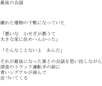 The poem was written after the 1995 Kobe earthquake. The poet has lived in the area all his life and was affected by the disaster.